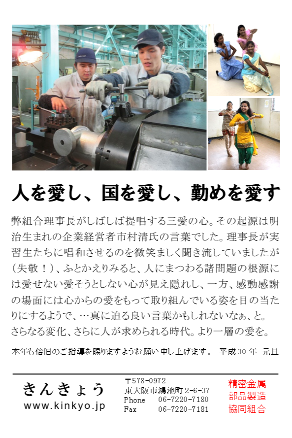 2018 謹賀新年 2018.01.01 人を愛し、国を愛し、勤めを愛す 弊組合理事長がしばしば提唱する三愛の心。その起源は明治生まれの企業経営者市村清氏の言葉でした。理事長が実習生たちに唱和させるのを微笑ましく聞き流していましたが(失敬!)、ふとかえりみると、人にまつわる諸問題の根源には愛せない愛そうとしない心が見え隠れし、一方、感動感謝の場面には心からの愛をもって取り組んでいる姿を目の当たりにするようで、・・・真に迫る良い言葉かもしれないなぁ、と。 さらなる変化、さらに人が求められる時代。より一層の愛を。
