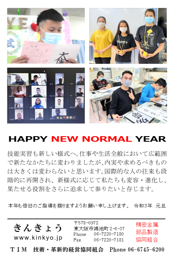 2021 謹賀新年 2021.01.01 HAPPY NEW NORMAL YEAR 技能実習も新しい様式へ。仕事や生活全般において広範囲で新たなかたちに変わりましたが、内実や求めるべきものは大きくは変わらないと思います。国際的な人の往来も段階的に再開され、新様式に応じて私たちも変容・進化し、果たせる役割をさらに追求して参りたいと存じます。