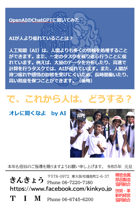 2023 謹賀新年 2023.01.01 OpenAIのChatGPTに聞いてみた AIが人より優れていることは? 人工知能(AI)は、人間よりも多くの情報を処理することができます。また、一定のタスクを繰り返し行うことに優れています。例えば、大量のデータを分析したり、高速で計算を行うタスクでは、AIが優れています。また、人間が持つ疲れや感情の影響を受けにくいため、長時間働いたり、高い精度を保つことができます。(後略) で、これから人は、どうする? オレに聞くなよ by AI