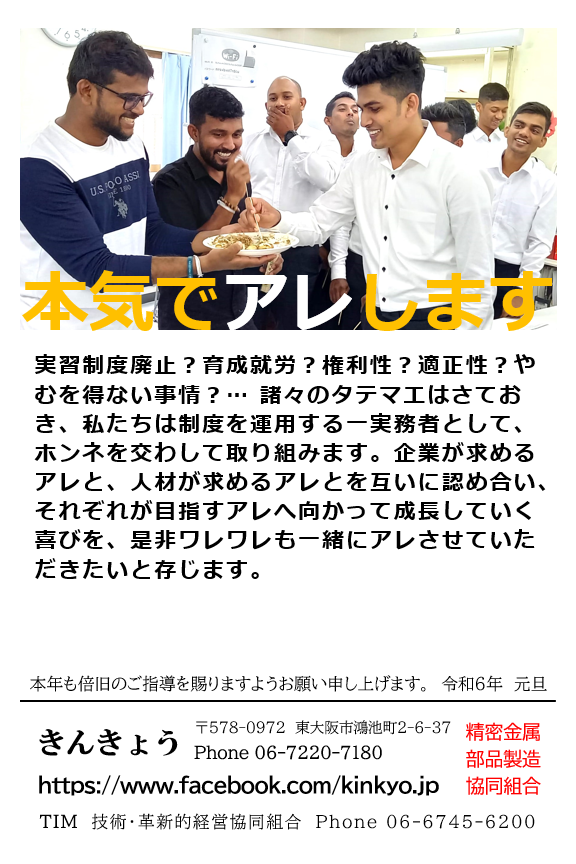 2024 謹賀新年 2024.01.01 本気でアレします 実習制度廃止?育成就労?権利性?適正性?やむを得ない事情?… 諸々のタテマエはさておき、私たちは制度を運用する一実務者として、ホンネを交わして取り組みます。企業が求めるアレと、人材が求めるアレとを互いに認め合い、それぞれが目指すアレへ向かって成長していく喜びを、是非ワレワレも一緒にアレさせていただきたいと存じます。