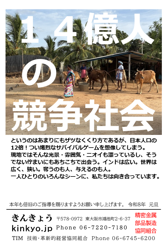 2026 謹賀新年 2026.01.01 14億人の競争社会 というのはあまりにもザツなくくり方であるが、日本人口の12倍!つい熾烈なサバイバルゲームを想像してしまう。現地ではそんな光景・雰囲気・ニオイも漂っているし、そうでない佇まいにもあちこちで出会う。インドは広い。世界は広く、狭い。奪うのも人、与えるのも人。 一人ひとりのいろんなシーンに、私たちは向き合っています。